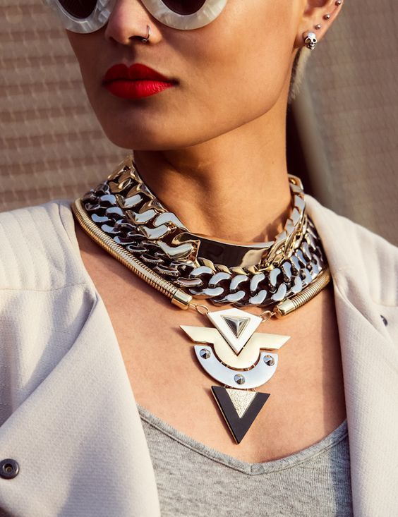 Отдельно стоит выделить металлические ожерелья в виде разнообразных изогнутых пластин. Блестящие, гладкие, широкие чокеры и нагрудники привлекут как любительниц минимализма, так и более провокационных образов.