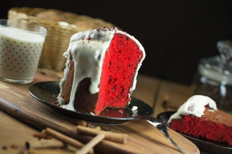 Кулич насыщенного красного цвета будет идеально смотреться с минималистичной красной помадкой сверху.