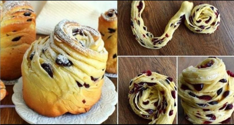 Смазываем обильно сливочным маслом, посыпаем сухофруктами и сворачиваем в рулет. Острым ножом разрезаем рулет несколько раз в длину, не доходя до конца 2-3 см. Формируем краффин спиралью так, чтобы сторона с разрезами была с внешней стороны. Кладем рулет в высокую узкую форму, оставляем отдыхать на 10-15 минут.