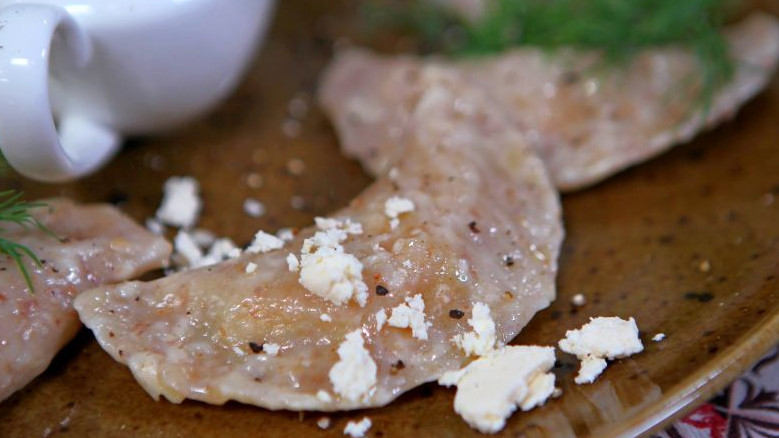 Затем добавь в пюре измельченный укроп и покроши брынзу. Перемешай. Раскатай тесто, с помощью стакана вырежь кружки. На каждый кружок положи начинку и защипни края. Вари вареники в подсоленной воде 7-10 минут. Затем слей воду, добавь оставшееся масло и перемешай. По желанию, подавай вареники со сметаной, укропом и брынзой, посыпав черным перцем.