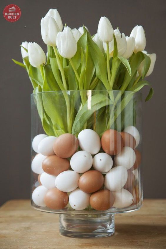 Пасха - праздник возрождения и спасения, поэтому отлично поставить букет свежих цветов на стол. Чтобы он выглядел особенным - поставь цветы в узкий стакан с водой, поставь в середину широкой стеклянной вазы, а вокруг выложи покрашенные яйца.