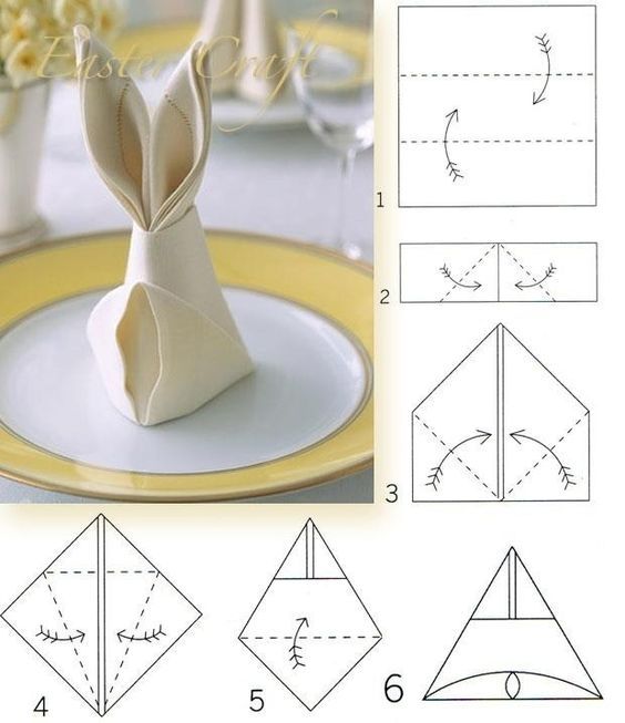 Сложи текстильные салфетки в форме заячьих ушек для того, чтобы твой стол выглядел особенно по-весеннему. Другой вариант - более простой и подойдет в том числе для больших бумажных салфеток. Сложи салфетку в треугольник, а потом «гармошкой», в середину положи вареное яйцо и закрепи салфетку вокруг яйца, завязав резинкой, веревочкой или праздничной прищепкой.