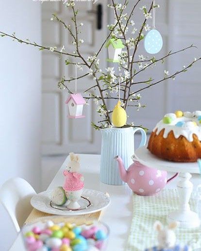 Из молодых или цветущих веточек можно сделать замечательный, воздушный центральный декор для стола. Просто сделай или купи несколько простых тематических подвесок на них: из пустой скорлупы, бумаги или фетра, и получится нежный декор для главного места на столе.