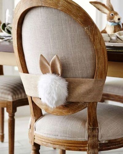 Сделай милые пушистые заячьи «хвостики» на все стулья. Так каждый гость, сидящий за столом станет немножко пасхальным кроликов. Изготовить их можно из искусственного меха, шерсти для валяния, толстых ниток или обычной ваты.