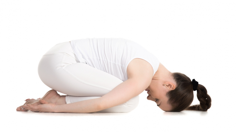Стань на колени, разведи их на ширину плеч, большие пальцы ног должны соприкасаться. Постепенно наклоняйся вниз, пока не сядешь между собственных бедер. Лбом нужно касаться пола. Задержись в этом положении комфортное для себя время, не забывай про дыхание. В позе оставайся 5-6 дыхательных циклов (вдох-выдох это 1 цикл).
