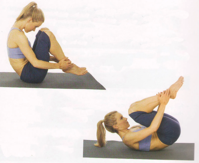 Ляг на спину и прижми колени к груди, обняв их. Скрести ноги вместе и обхвати голени руками. На вдохе попробуй сесть с этого положения. Затем выдохни и вернись обратно в начальную позу.