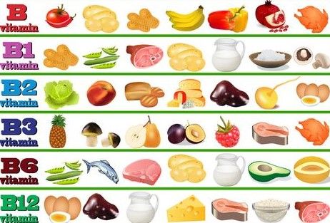 B1 содержится в печени, нежирной свинине, почках, гречке, овсянке, грецких орехах, кукурузе. B2 и B3 можно получить при употреблении печени и почек, твердых сыров и творог, яблок, миндаля, томатов, свежем горохе, яйцах.