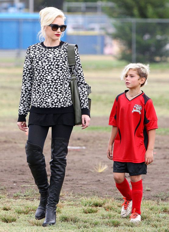 Певица Гвен Стефани для прогулки с детьми предпочла черно-белый свитер и черные лосины.