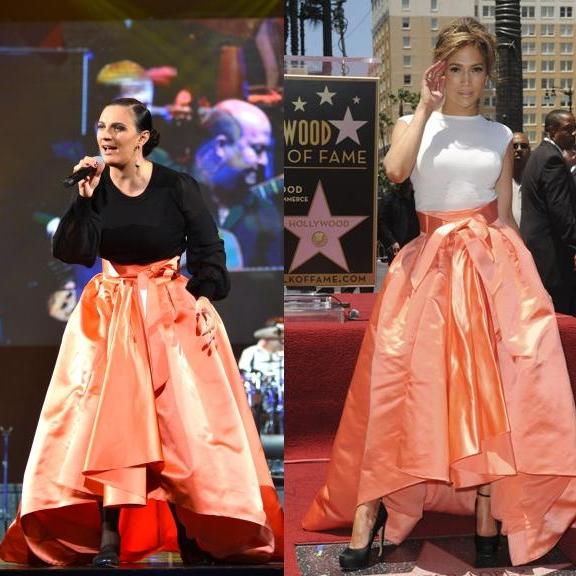 Обе красавицы появились на светских мероприятиях в одинаковых юбках от знаменитого бренда CHRISTIAN DIOR. Шелковая, ниспадающая роскошными фалдами, теплого персикового цвета, юбка выглядит потрясающе.