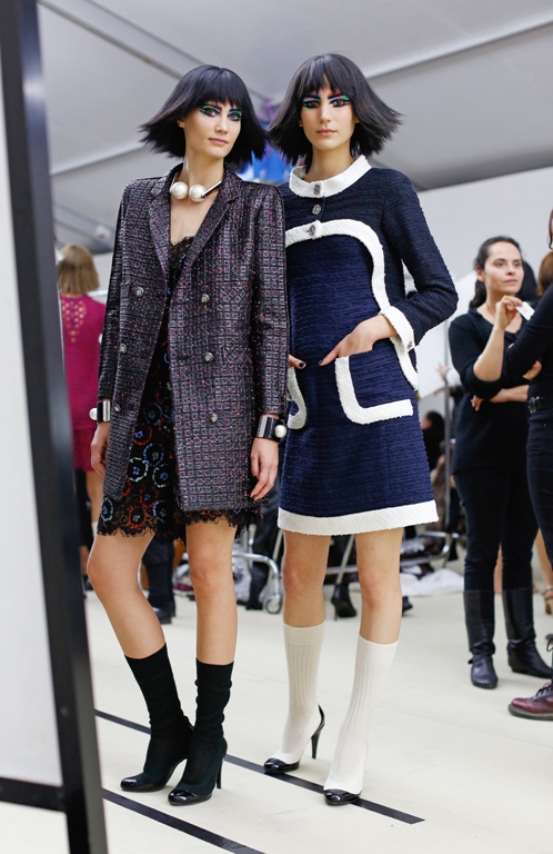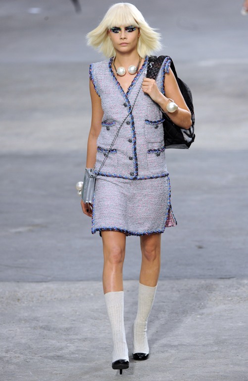 Ножки моделей Карл обул полусапожки, напоминающие знаменитые черно-белый штиблеты. Некоторой трансформации подвергся и традиционный классический твидовый костюм от Chanel.