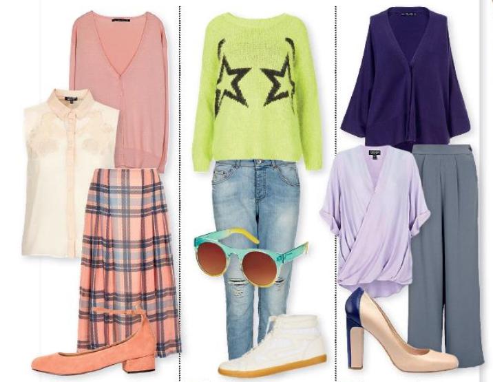 - Однотонную кофту миксуй с элегантной блузкой и юбкой в клетку.