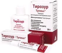 Применение Тирозура рекомендовано при кожных инфекциях, трофических язвах, ожогах, первично инфицированных ран при воспалениях слизистой, а также вторично инфицированных ран при кандидозе и экземе, для профилактики инфекций после операции. Препарат выпускается в виде геля и порошка, в 1 г которых содержится 1 мг тиротрицина.