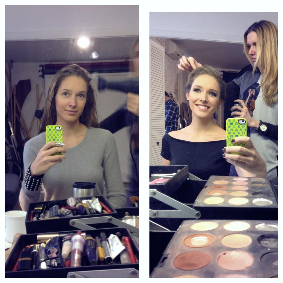 Закончился урок мастер-классом по стайлингу. Кстати, средства для укладки тоже придают сияние (даже если волосы пережили начес, как в нашем случае). Юрий предложил не экспериментировать и выбрать пену и лак Syoss Glossing Hold с уже проверенным эффектом ламинирования.