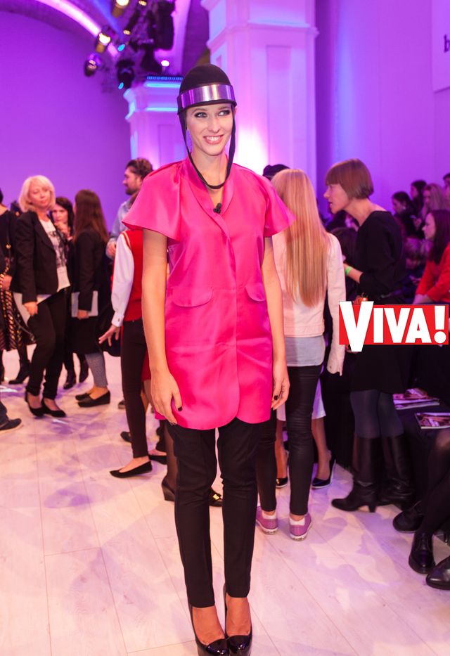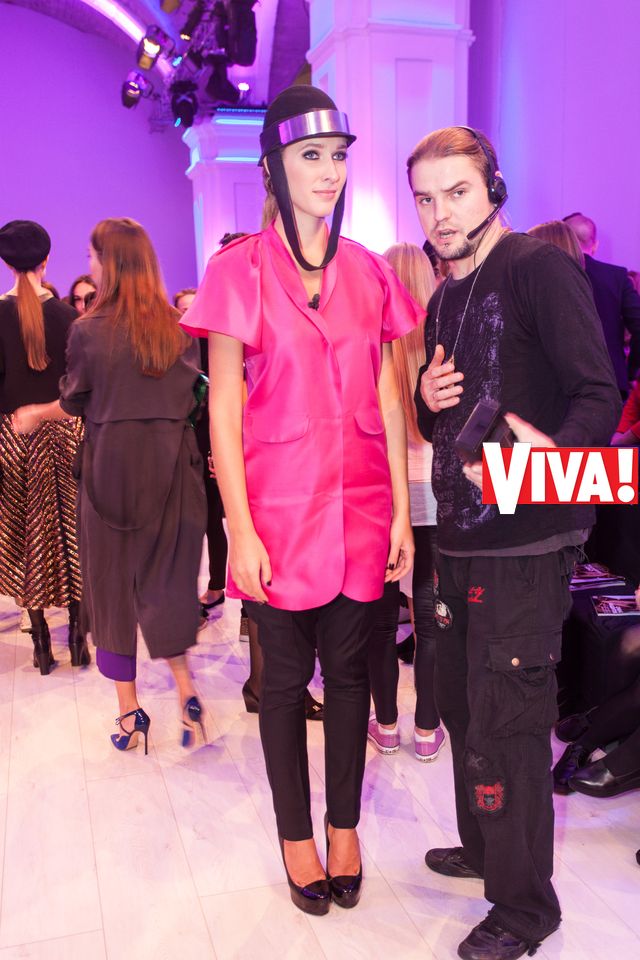 Катя Осадчая продолжает радовать своих поклонников яркими незабываемыми образами. Оригинальный наряд Катя выбрала и для Ukrainian Fashion Week. На одном из показов ведущая появилась в удлиненной розовой блузе, черных зауженных брюках и лаковых тефельках на высоких каблуках. Изюминкой образа стала черная шляпка-шлем с металлической вставкой по центру изделия и широкой лямкой.