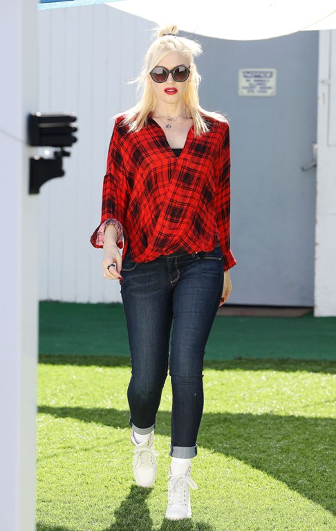 Гвен Стефани сочетала блузу в клетку с джинсами скинни. Получилось стильно.
