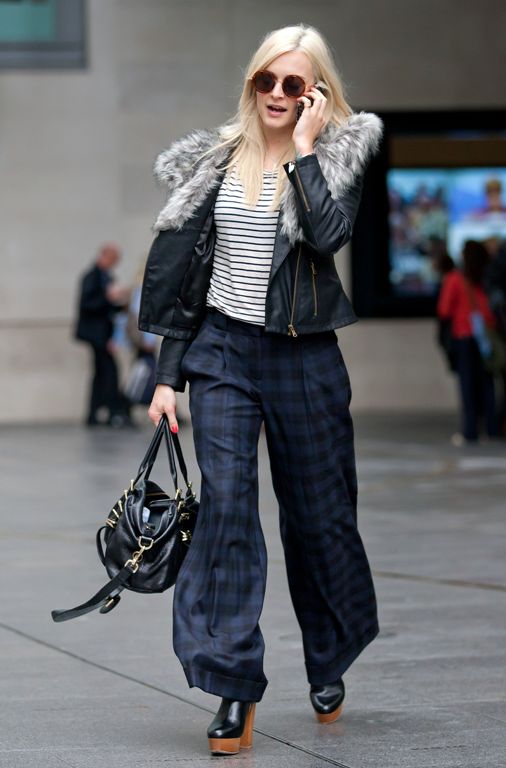 Телеведущая Ферни Коттон создала стильный образ при помощи клетчатых широких брюк, полосатого топа и ботинок на платформе.