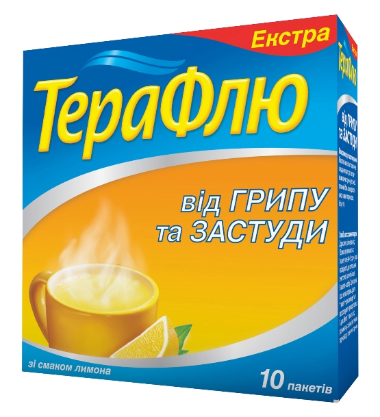 Реклама лікарського засобу. Перед застосуванням проконсультуйтеся з лікарем та обов’язково ознайомтеся з інструкцією для медичного застосування. Перелік протипоказань та побічних ефектів зазначено в інструкції для медичного застосування. Терафлю Екстра зі смаком лимона, порошок для орального розчину, №1, №10. Р.П. № UA/5797/01/01 від 06.09.2011. .png)
