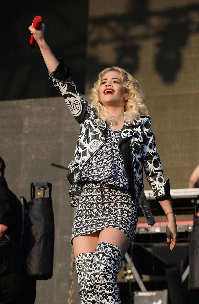 Певица Рита Ора решила не ограничивать себя при подборе вещей с атрибутикой прздника. Красотка выбрала для выступление оригинальное платьице с забавными черепками, дополнив его аналогичными курткой и сапожками.