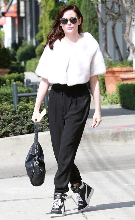 Белая меховая накидка выглядит, конечно, необычно в повседневной жизни. Однако образ достоин внимания. Пример подает актриса Роуз Макгован. Обрати внимание на обувь – она спортивная, тем не менее, провальным этот образ язык не поворачивается назвать.