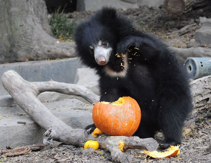 На Хэллоуин в зоопарке Брукфилд в Чикаго тыквами угостили снежного барса, медвежонка, сурикатов, орангутангов, летучих мышей.