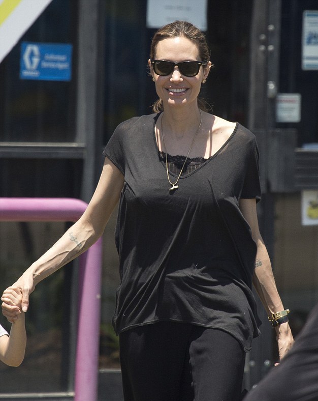 Анджелину сфотографировали, когда она вместе с близнецами Ноксом и Вивьен отправилась по магазинам. Для прогулки Джоли выбрала черную футболку с коротким рукавом и черные штаны. Наряд как нельзя лучше подчеркивал худобу актрисы.