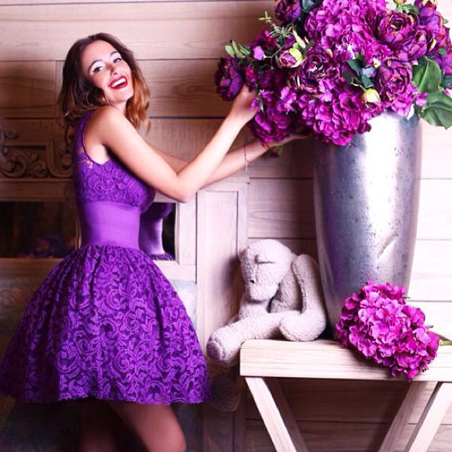 Для новой фотосессии девушка выбрала очаровательное фиолетовое платье с пышной юбкой. Девушка незамедлительно поделилась новыми снимками со своими читателями в Инстаграм.