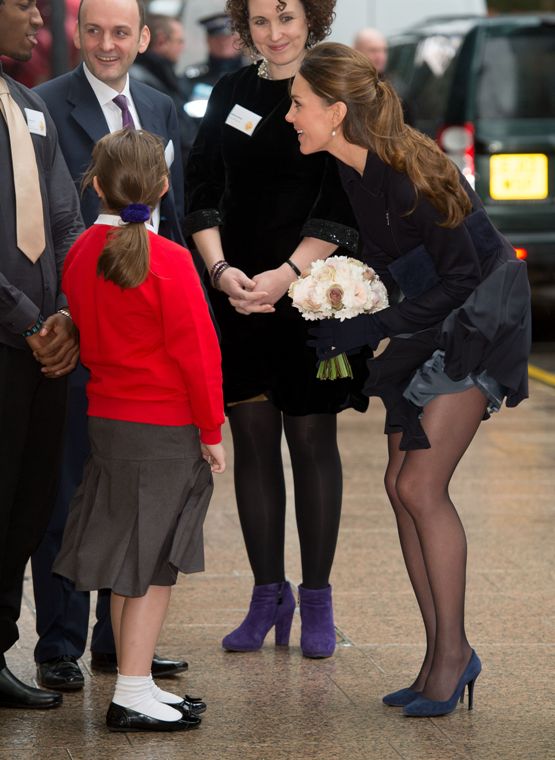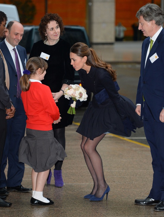 Ветер кокетливо развевал модную юбку, и фотографам удалось сделать несколько симпатичных кадров. Например, когда маленькая поклонница Тирни Поттер вручила Кэтрин красивый букет.