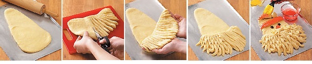 Раздели меньшую часть теста пополам. Сделай полукруг – бороду, тесто надрежь одинаковыми полосками толщиной 2 см. Остальное тесто используй, чтобы сделать нос, усы, волосы и помпон на шапке. Верхушку треугольника немного подогни и прикрепи помпон.