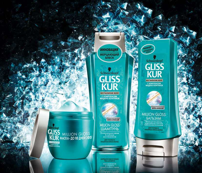 В результате применения средств линии Gliss Kur Million Gloss тусклые, лишенные блеска волосы приобретают здоровый, ухоженный вид, становятся гладкими и сияющими.