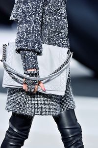 - «Цепные» аксессуары великолепны в компании с лаковой кожей и трикотажем.
