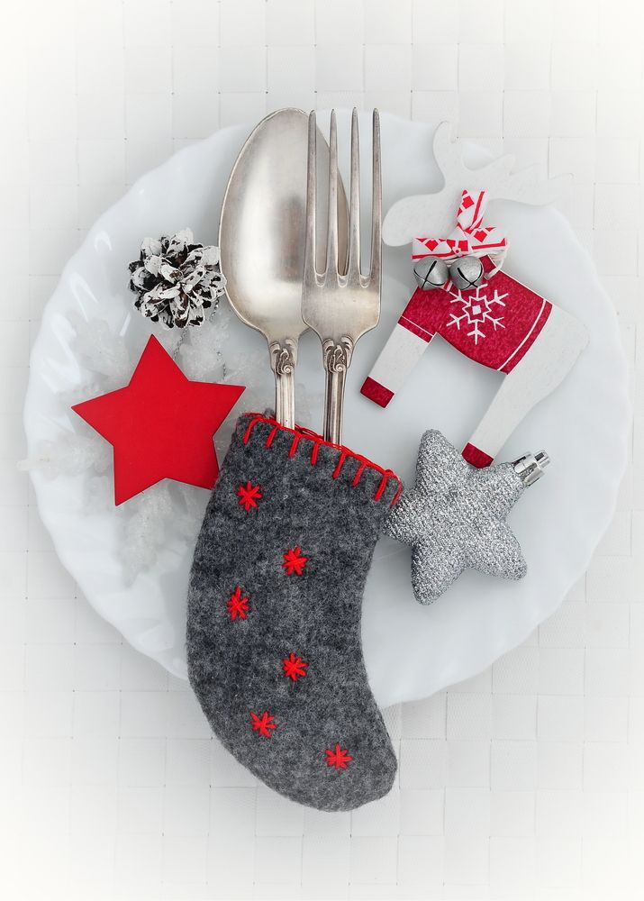 Из серого фетра сшей небольшие кармашки-валенки. Красной шерстяной ниткой или мулине вышей снежинки и обвяжи края. Положи в кармашки приборы.