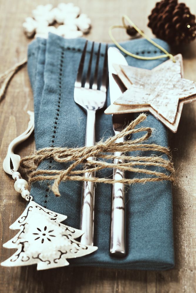 Полотняную салфетку сложи прямоугольником, помести на нее столовые приборы и обвяжи вместе с салфеткой шпагатом. Укрась вырезанными из картона звездочками и снежинками.