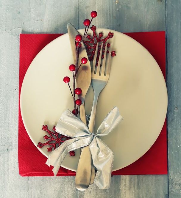 Положи вместе с приборами веточку падуба, омелы или окрашенную акриловой краской сухую веточку. Цвет краски должен соответствовать тону салфетки. Перевяжи атласной лентой.