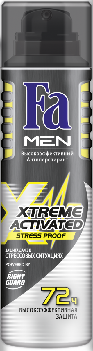 Дезодорант Fa MEN XTREME ACTIVATED Stress Proof разработан в нескольких удобных форматах: аэрозоль, ролик и стик. Высокоэффективный антиперспирант Fa MEN XTREME ACTIVATED Stress Proof обеспечивает защиту от пота на 72 часа даже в условиях стресса. Новинка не содержит спирта.