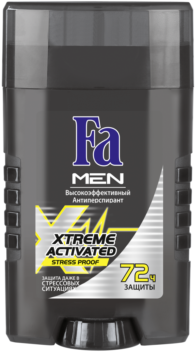 59% мужчин часто испытывают стресс на работе или постоянно находятся в состоянии цейтнота. Выброс адреналина в организме мужчины, вызванный этими факторами, приводит к более сильному потоотделению, чем когда представитель сильного пола спокоен и уверен в себе. Fa MEN XTREME ACTIVATED Stress Proof – первый дезодорант от Fa MEN, реагирующий на стресс. Его высокоэффективная формула обеспечивает защиту от пота на 72 часа и нейтрализует неприятный запах, когда это особенно необходимо.
