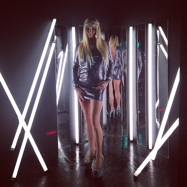 В рамках промо клипа Настя показала свой новогодний образ. Красавица опубликовала фото, на котором облачена в серебристом мини-платье. Свой образ Волочкова дополнила туфлями на платформе и красивым украшением с крупными камнями.