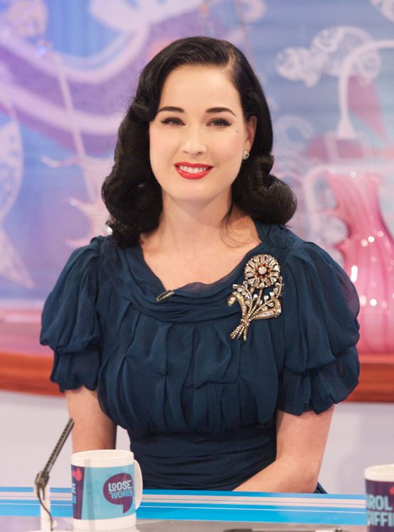 Одно, но массивное и красивое украшение, в частности брошь, запросто создаст праздничный образ. Пример подает королева бурлеска Дита Фон Тиз.