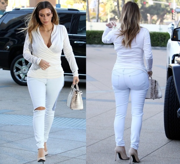 Для этого Ким выбрала джинсы, туфли и блузу светлых тонов, что позволило зрительно удлинить фигуру. Рваные джинсы помогли немного отвлечь внимание от бедер. Белая блуза с драпировкой на талии и на груди сделала фигуру более гармоничной и скрыла слишком большой бюст. Свой образ Ким дополнила сумочкой из кожи крокодила Hermes Birkin и бежевыми туфельками на небольшом каблуке.