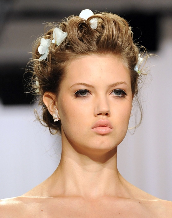 Героиня весны 2014 от Zac Posen – романтичная и томная: скромный макияж, пряди, как будто случайно выбившиеся из прически, цветы в волосах и цветы в качестве украшений.