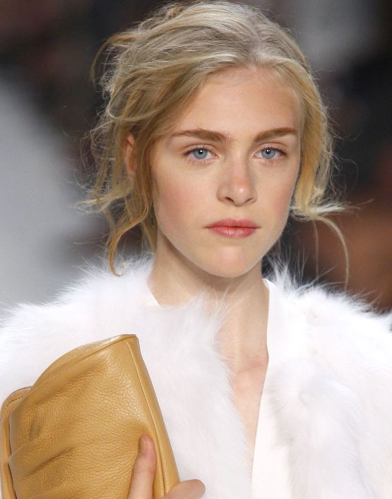 Модный образ сезона весна-лето 2014 на показе Michael Kors – нежный тон для лица, розовая помада, густые брови и естественные локоны.