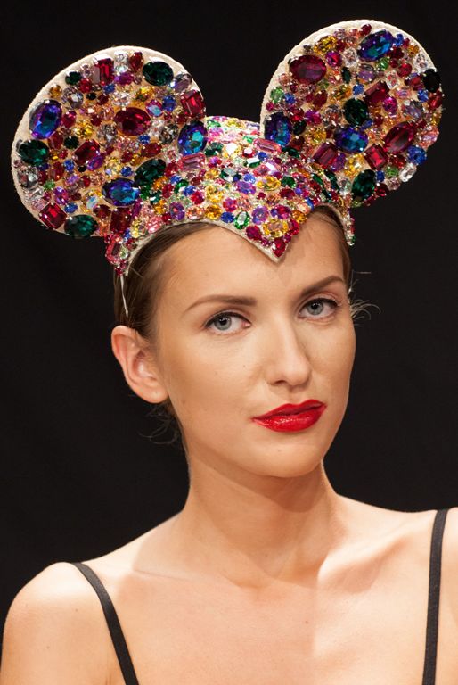 Гламурно-мультяшный образ от Anya Caliendo пророчит популярность ушкам Микки в этом сезоне. Ну а красная помада никогда не выходит из моды.