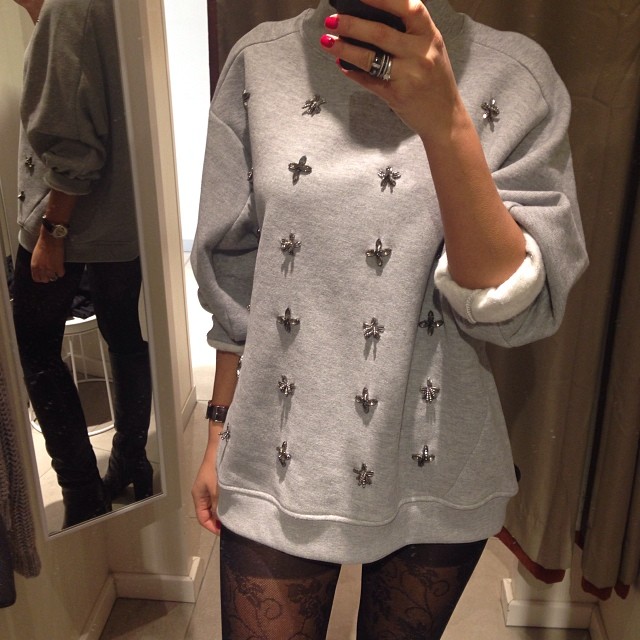 В одном из бутиков Яна решила выбрать свитшот со стразами. И примерила стильный джемпер совершенно без юбки – в комплекте с красивыми колготкам с цветочным принтом и высокими сапогами. Образ получился элегантный, тем более что идеальная фигура Яны Станишевской позволяет такие рискованные модные эксперименты.