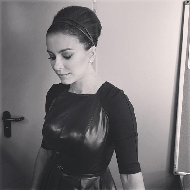 Ани предстала на съемках в стильном ретро-образе: черном платье с кожаной вставкой, без выреза впереди. Стильный образ Ани дополнила высокая прическа с обручем. Фото, опубликованное в микроблоге, Ани Лорак подписала так: