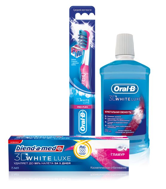 Для использования вместе с зубными пастами Blend-a-med 3D White Luxe идеально подходит новая зубная щетка Oral-B 3D White Luxe Pro-Flex. Благодаря подвижным сторонам головки, которые адаптируются к контурам зубов и линии десен, и мягким резиновым вставкам в щетине новинка бережно и тщательно чистит зубы и удаляет налет.