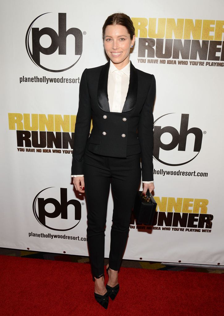 Элегантный брючный наряд Джессики Бил идеально подчеркивает все прелести фигуры актрисы. А оригинальный крой выделяет его на фоне классических брючных костюмов.