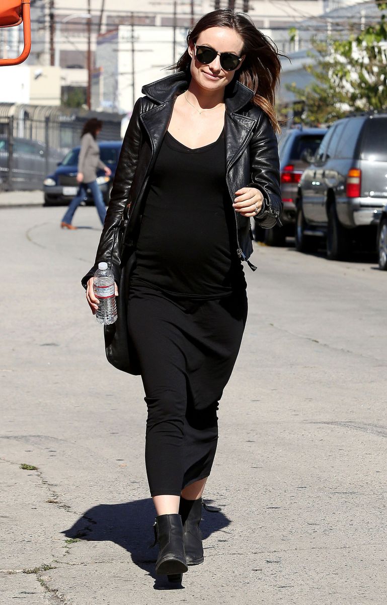 Оливия в повседневной жизни предпочитает спортивный стиль. Не изменила девушка своему вкусу и во время беременности. Для прогулки звезды выбрала в первую очередь комфортную одежду: черную длинную юбку, футболку и кожаную куртку.