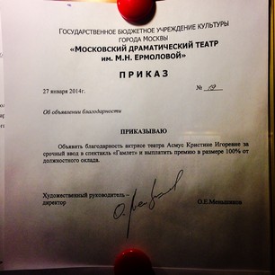 Олег Меньшиков выписал Кристине солидную премию. На радостях Кристина рассказала об этом в своей Инстаграм и даже опубликовала фото приказа, подписав его: «Вот это неожиданность! )))»