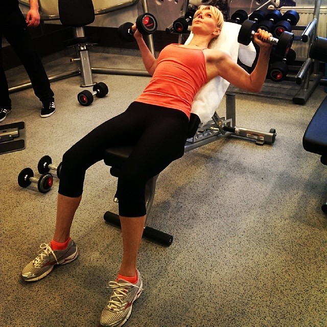 Об этом она сообщила поклонникам в соцсетях, а в подтверждение поделилась фотографией: «Продолжаем заниматься фитнесом. Курган.Тренажерный зал маленький в отеле,но есть всё необходимое».