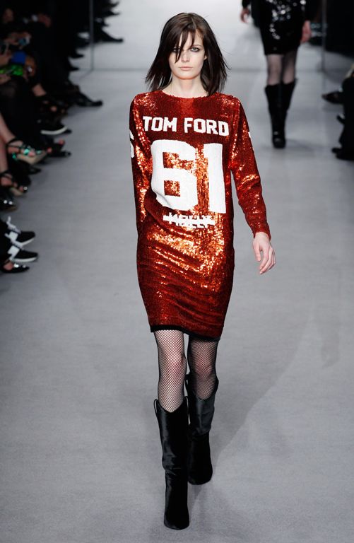 Коллекция удивила всех поклонников работ Тома Форда. Как сказал сам дизайнер, ему захотелось свернуть с привычной стези и попробовать что-то новое. Модели дефилировали под релиз рэпера Джей-Зи. Вся коллекция выполнена в стиле хип-хопа: например, платья в спортивном стиле, расшитые пайетками с логотипом Tom Ford 61.