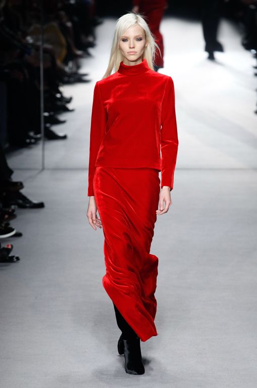 Есть стильные наряды из кашемира и бархата черного и красного оттенков. Все модели довольно скромные – без декольте и мини-юбок. Силуэты женственные, приталенные и в основном ровные.